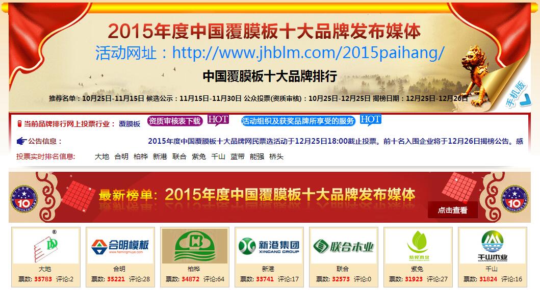 熱烈祝賀合明木業榮獲2015年度“中國覆膜板十大品牌”第二名。據悉,此次評選經過篩選國內具有代表性的覆膜板品牌上榜,再經過一個月網絡投票,最終按照票數從高到低排列,前十名者入選。