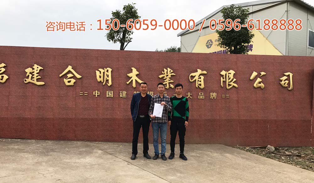 1月8日,寧波奉化合明模板總經銷商--優達建材商行、應全明木材經營部兩位負責人,專程到合明工廠進行年度考察,并成功簽訂2017年度銷售量16萬張以上的經銷合同。