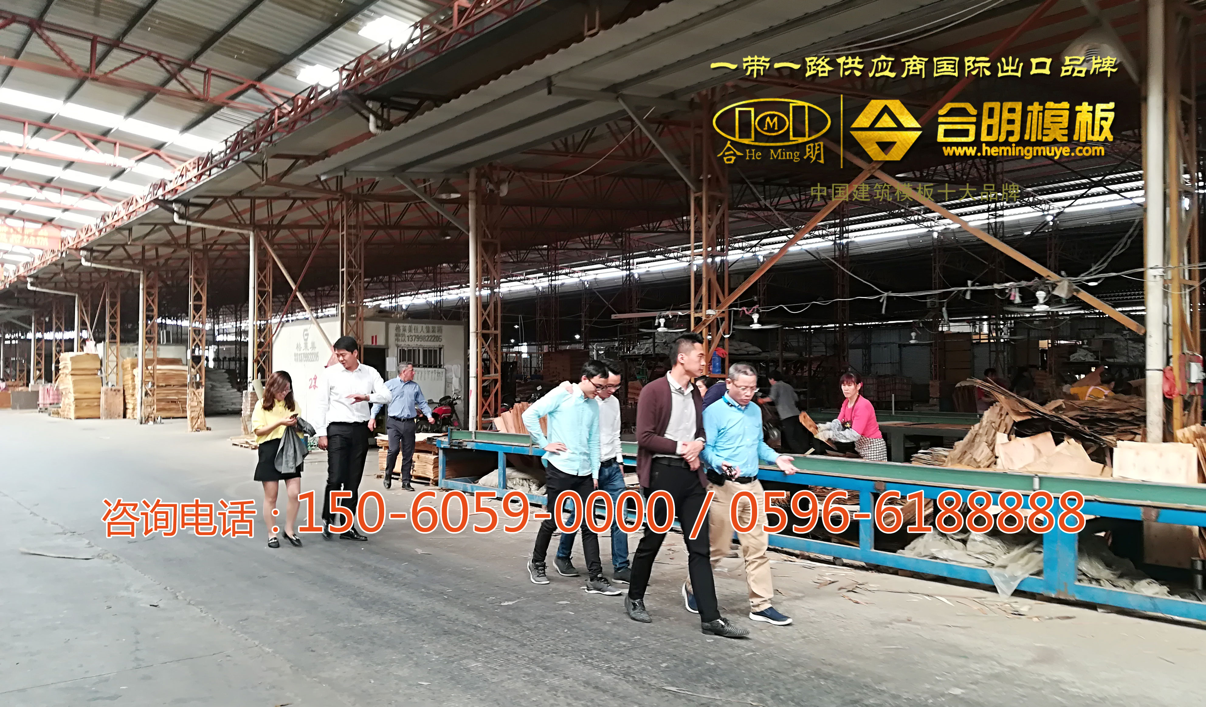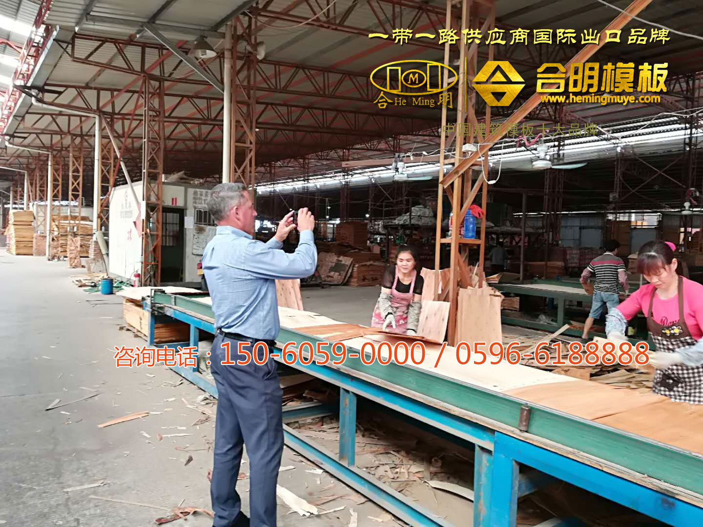 合明建筑模板產業園規模大型,引進先進生產設備,實行5s標準規范管理,壯觀的流水線,吸引外商不停拍照。