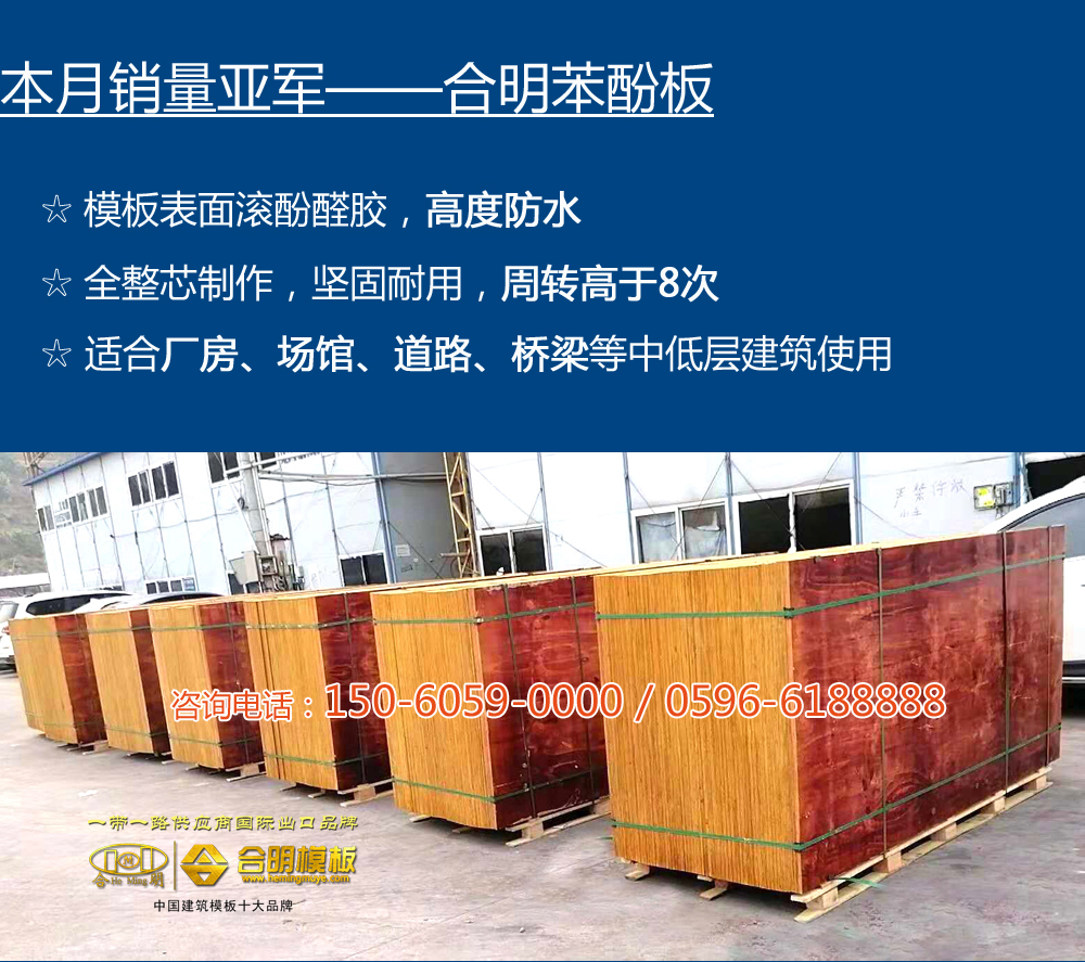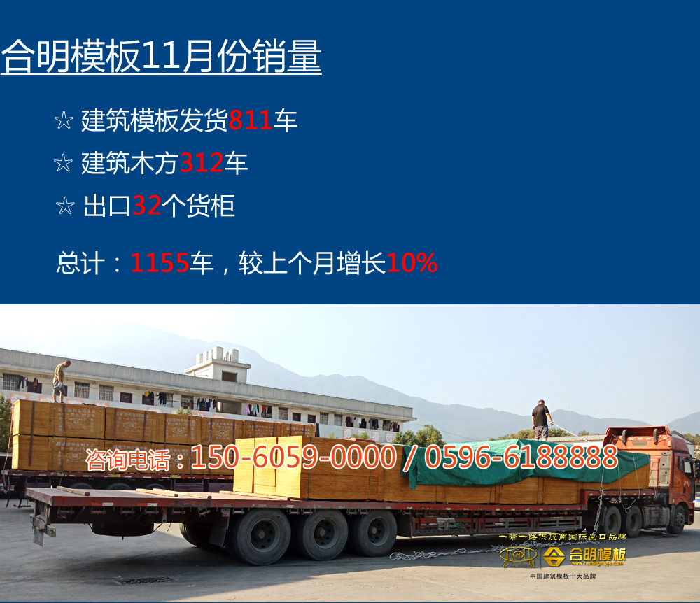 11月份,秋高氣爽,適宜工地施工,各地工程建筑模板需求量增加,合明模板本月銷量增長10%,合明覆膜板、合明苯酚板當仁不讓,穩居銷量鰲頭。