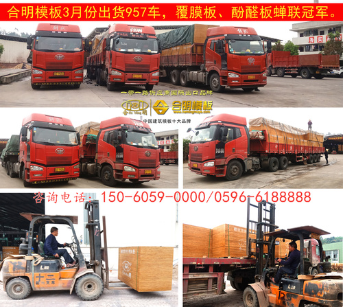 3月份,合明模板出貨量大大增加,創歷史新高:建筑模板發貨957車,建筑木方發貨303車,出口建筑模板102個貨柜,總計1362車,比去年3月份增長45%。