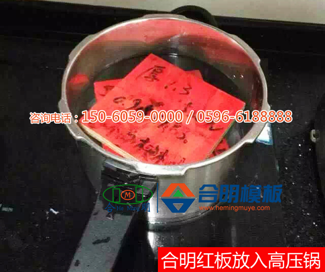 合明模板邊角料(合明模板樣板)在高壓鍋沸水煮2小時不開膠。一般在高壓鍋可以煮2小時不開膠的模板在工地使用中可周轉8次以上。