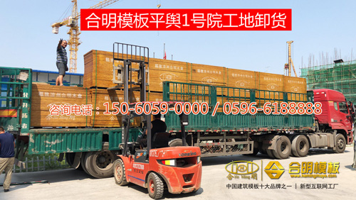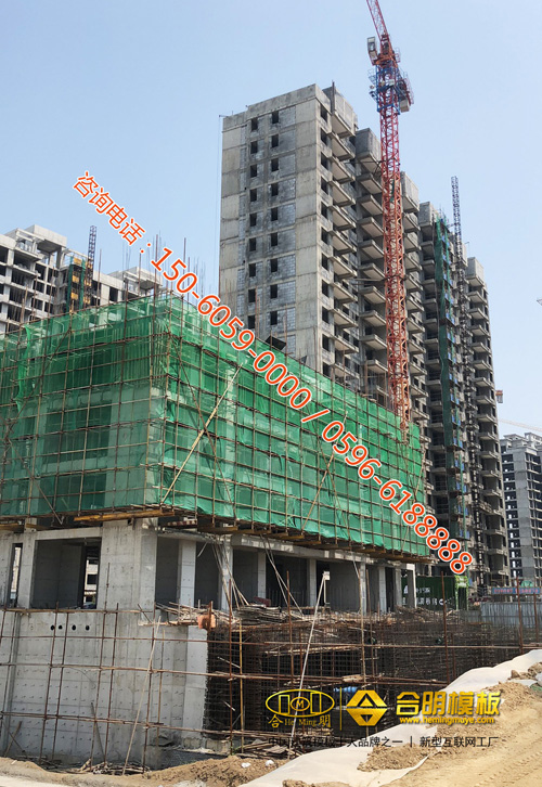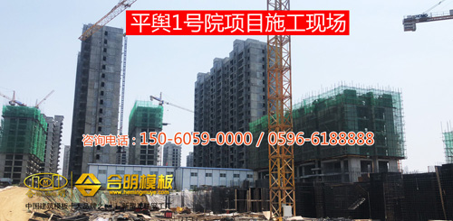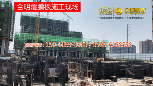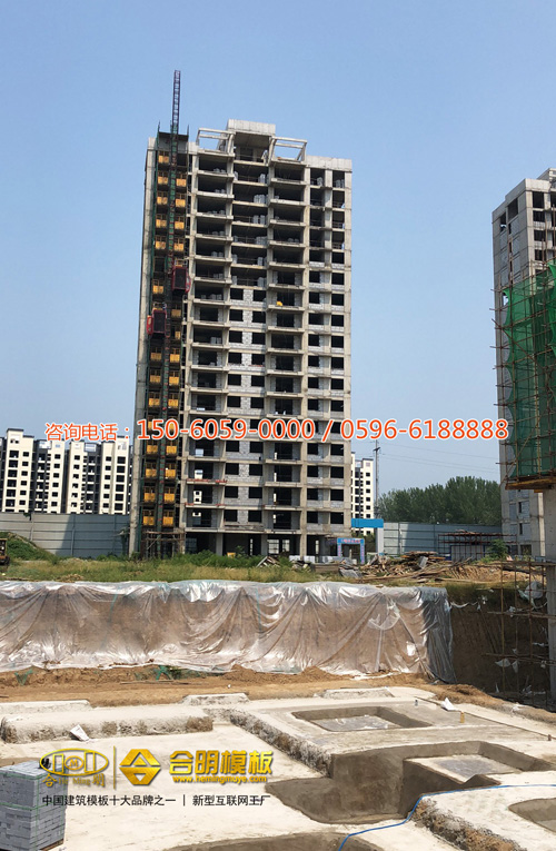 從施工照片可見,該工程8號樓正在施工,使用的是合明覆膜板。